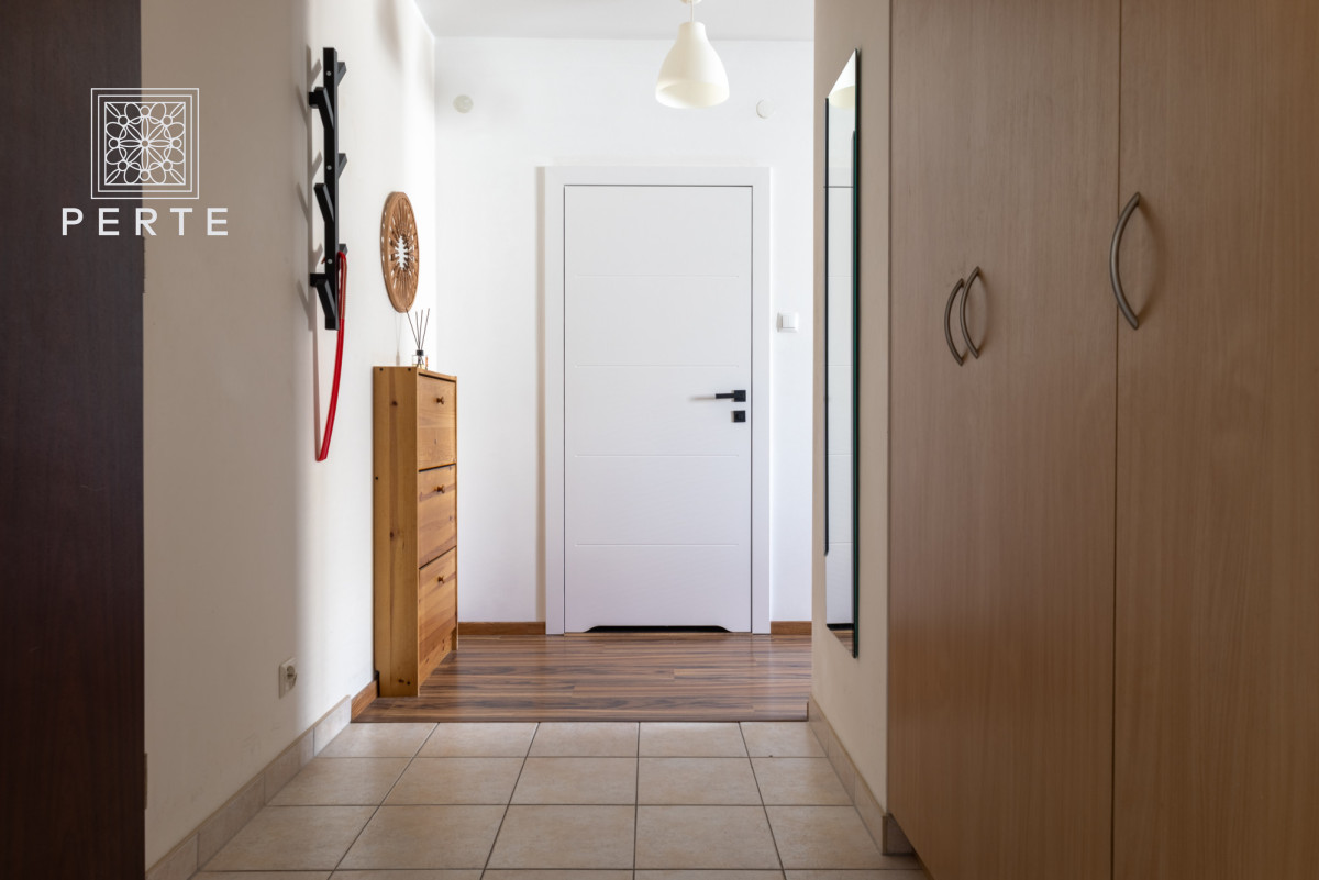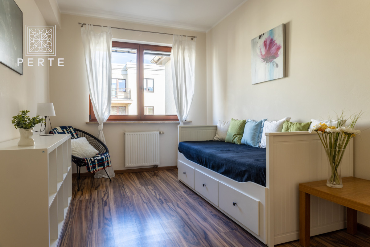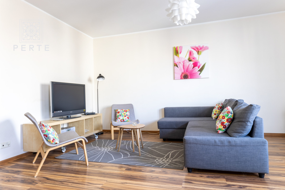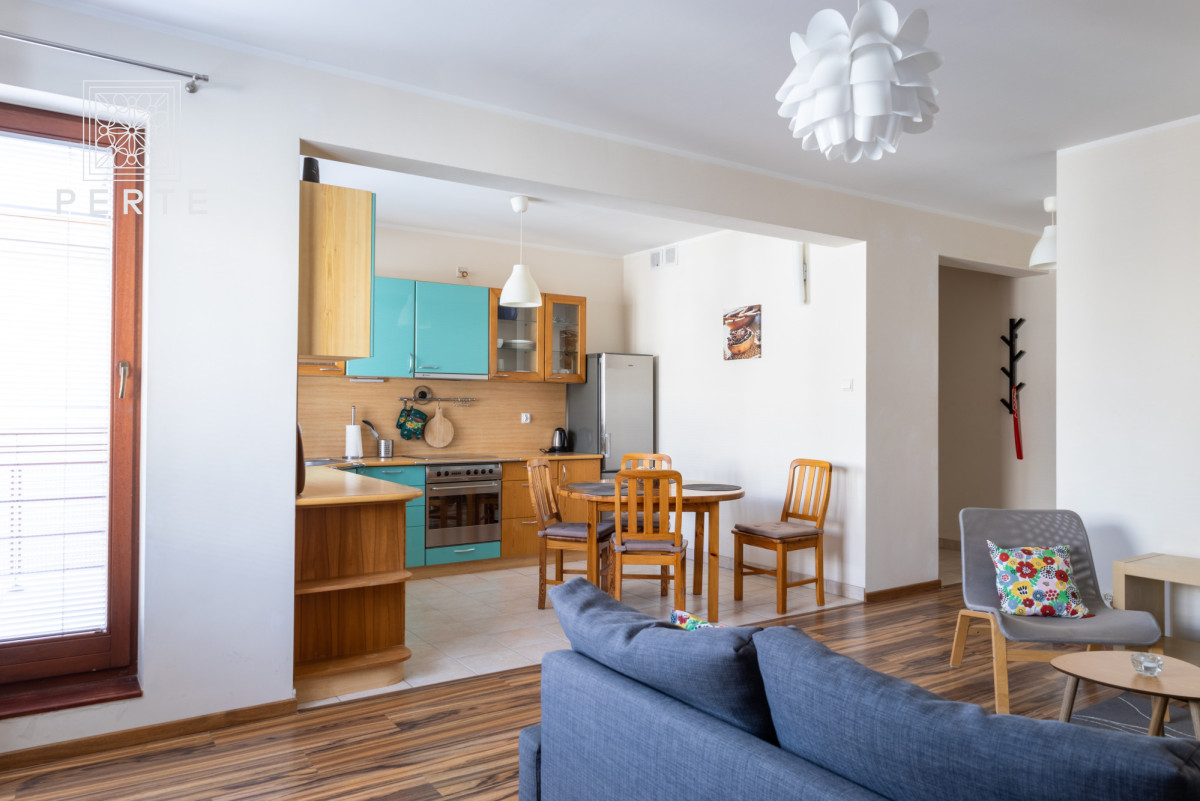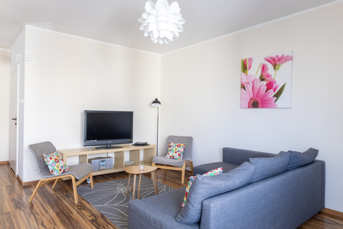 Wyposażenie: zabudowa meblowa w kuchni w tym: duża lodówka, kuchenka elektryczna z piekarnikiem, zmywarka, zlew oraz wygodny stół z czterema krzesłami. W części dziennej znajduje się: rozkładana sofa narożna, dwa fotele, niski stolik kawowy, szafka RTV + telewizor oraz konsola z dwoma krzesłami. W sypialni: rozkładane łóżko (szer. 160 cm), komoda, fotel, niski stolik oraz szafa. Całość wyposażenia mieszkania uzupełniają dywany, lampy, zasłonki oraz obrazy. W łazience znajduje się wanna z parawanem, duży blat z umywalką, lustro oraz szafki i co istotne - pralka. Ponadto w korytarzu: duża szafa, szafka na buty i wieszak.